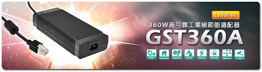 明緯GST家族自2015陸續上市18~280W,現已年銷數百萬台並廣受好評,為因應外接式電源更高功率需求,新推出了市面上少有的360W高功率Level VI節能適配器~GST360A系列。