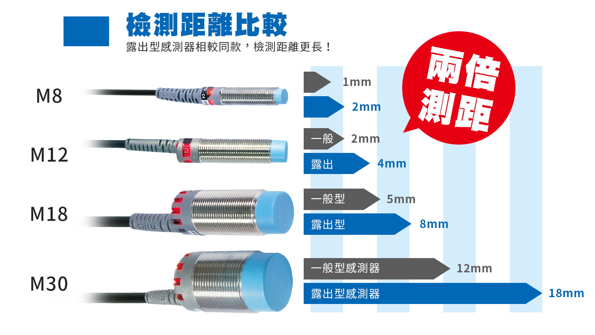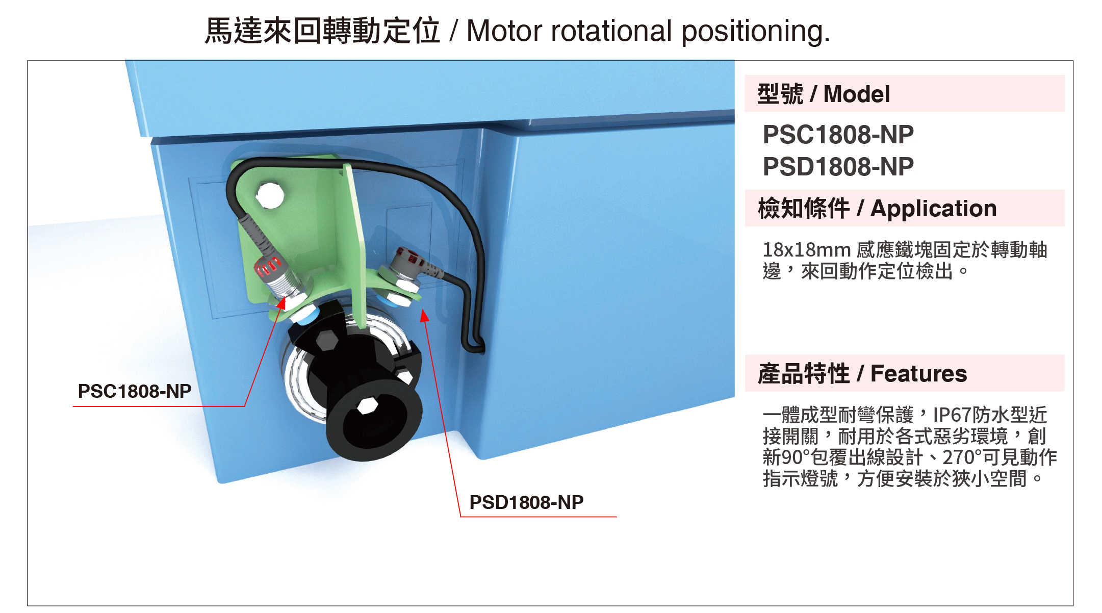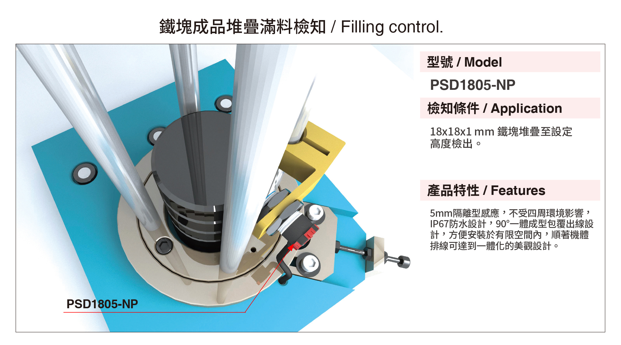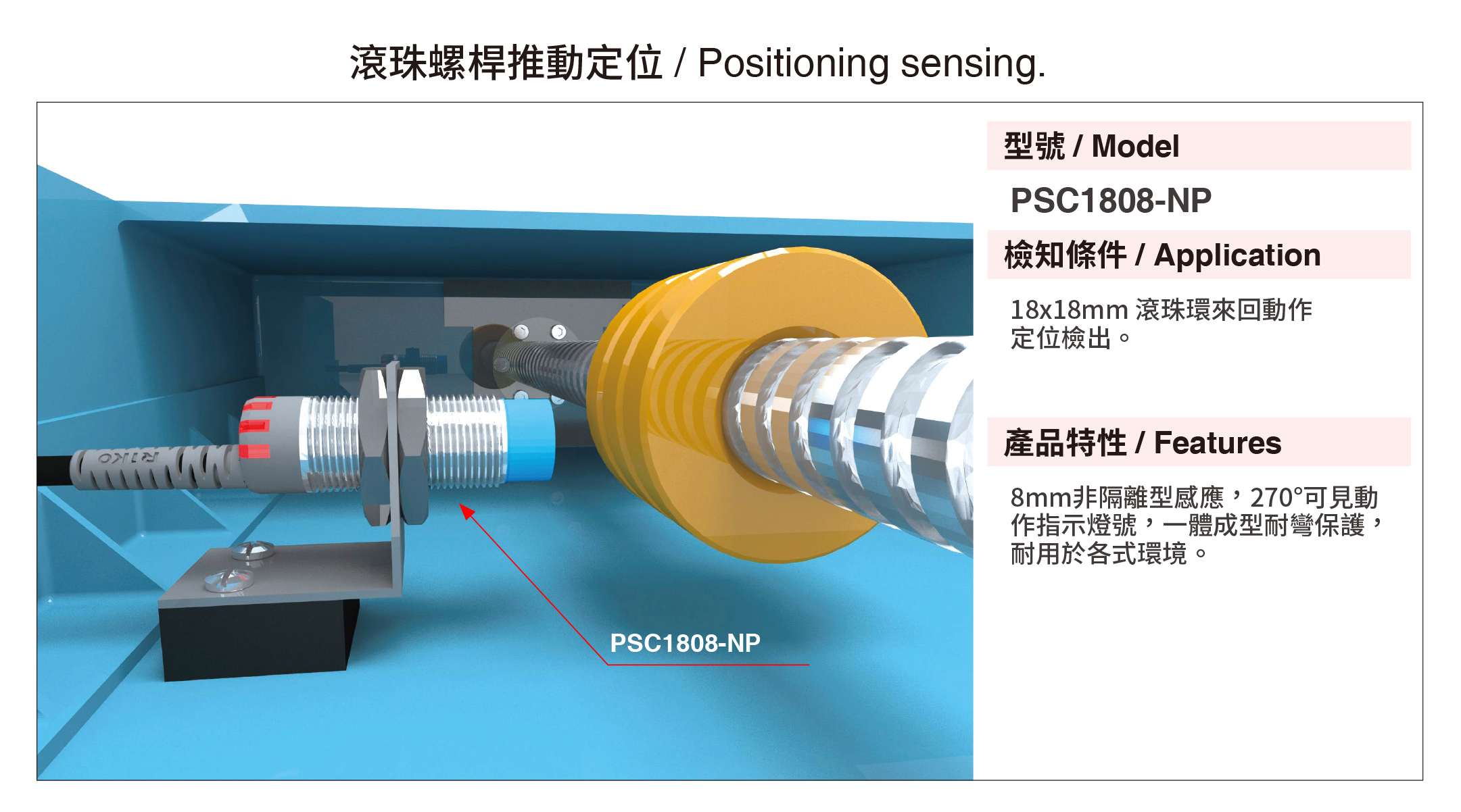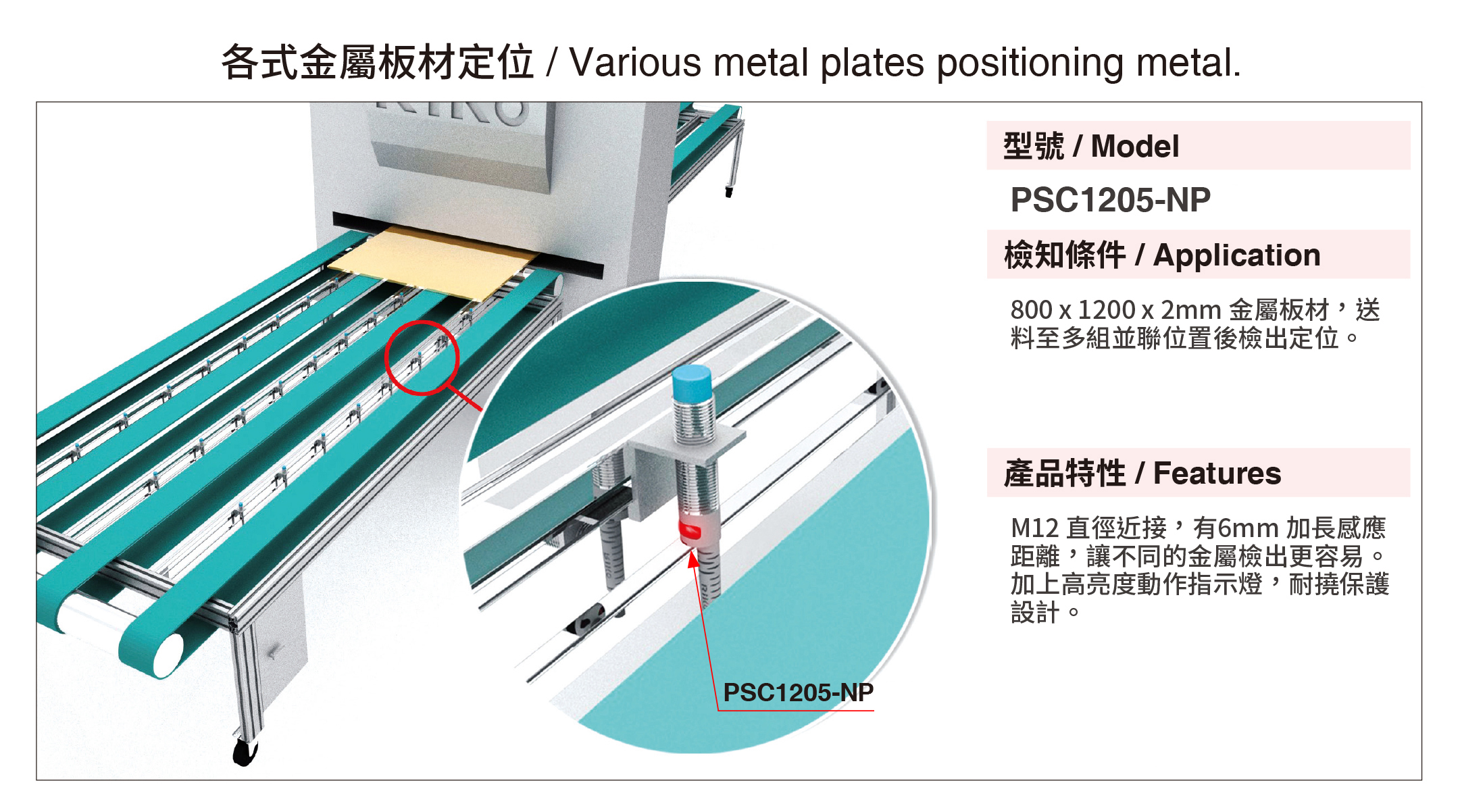 隨著工業4.0的潮流,工業自動化已是必然趨勢,近接感測器是自動化設備不可或缺重要組件之一,也是最常見的款式,常用於取代限位開關等接觸式的檢測方式,凡是不接觸檢測標的物而進行檢測的感測器,通稱為近接感測器,專用於檢測金屬(例如:鐵、鋁、銅、…等金屬)物體作動,將檢測標的物的移動資訊或存在資訊轉換成電性訊號。