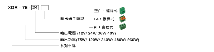 XDR系列:75W~960W 全新世代1Ø輸入超薄高階旗艦款導軌電源